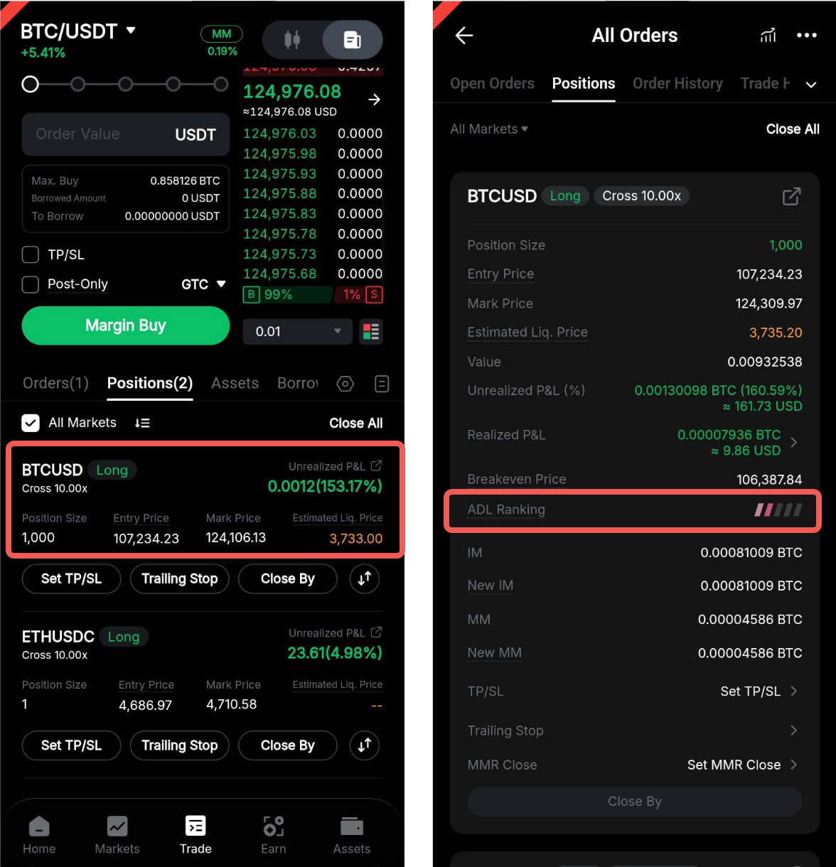 • Partially closing a highly leveraged position can reduce the number of contracts exposed to ADL risk, although it won't lower your ADL ranking.