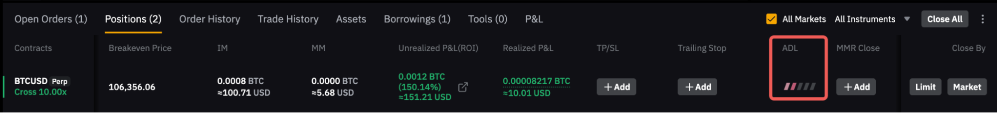 • Traders with the highest ADL rankings are selected first for deleveraging. Traders can refer to the ADL priority lights on their positions to estimate their ADL rankings.