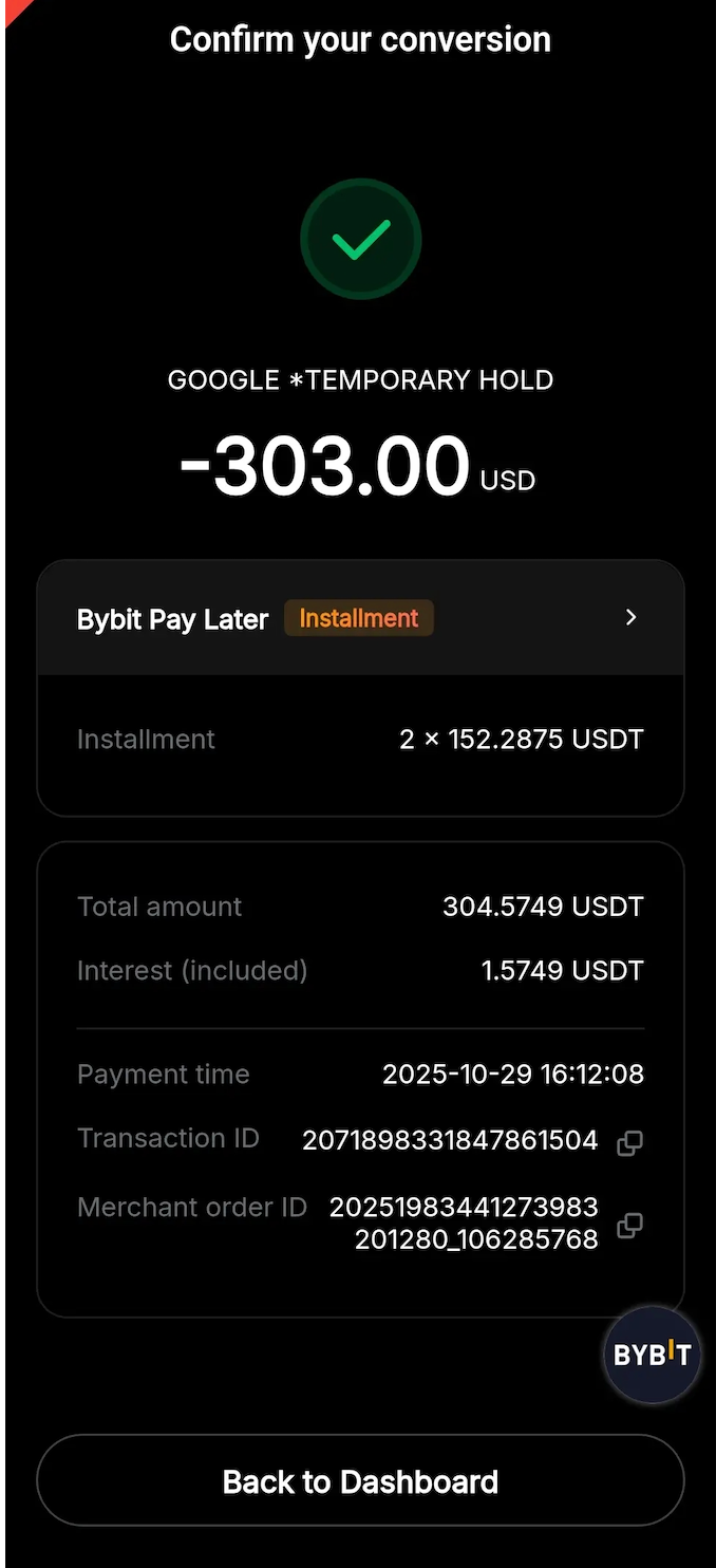 — Once a Pay Later order is confirmed, the installment plan cannot be changed or canceled. This means that even if your original Bybit Pay purchase is canceled or refunded, your Pay Later order will remain active, and you'll still need to make the required repayments according to your monthly statement.