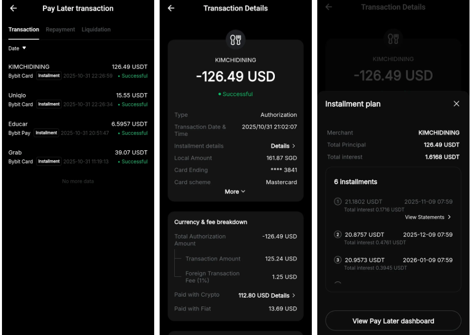 From there, switch between the Transaction, Repayment and Liquidation tabs to view relevant details. Tap any transaction to open its Payment Details page, and tap the right arrow icon in the Bybit Pay Later section for more information.