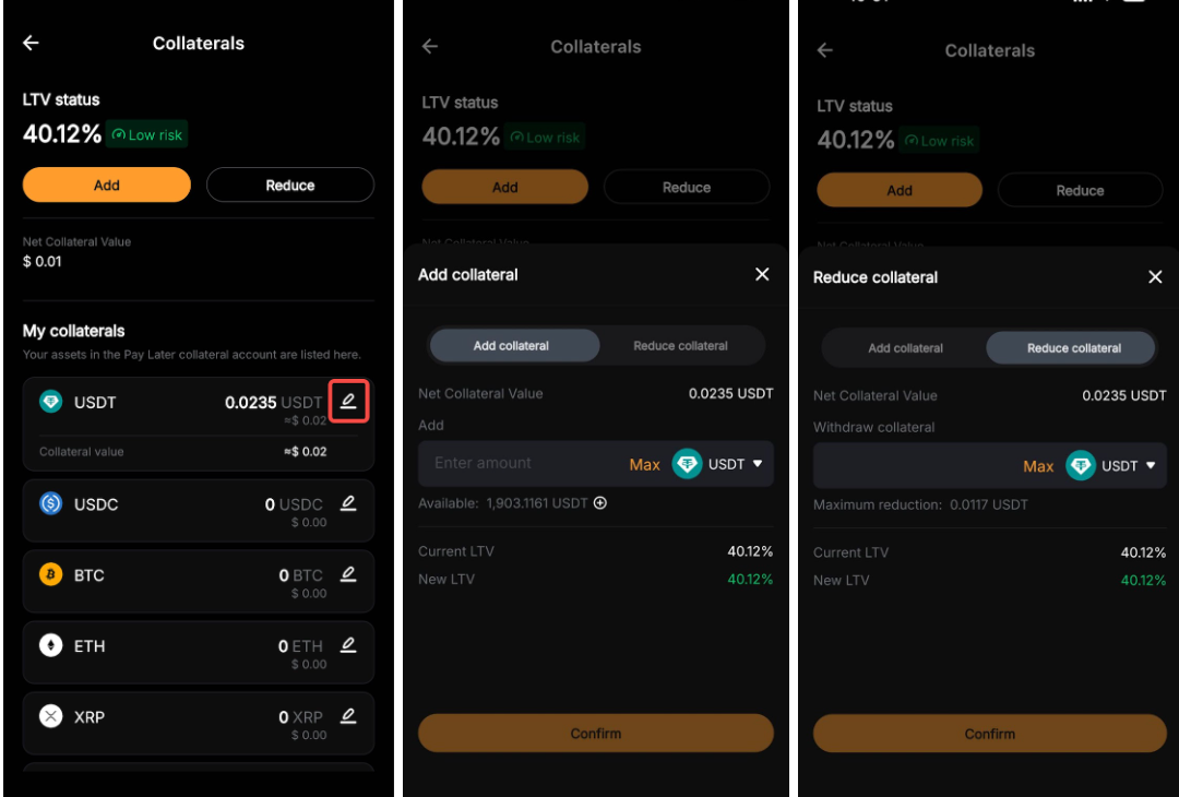 Step 3: On the Collaterals page, tap Add or Reduce to adjust your collateral.