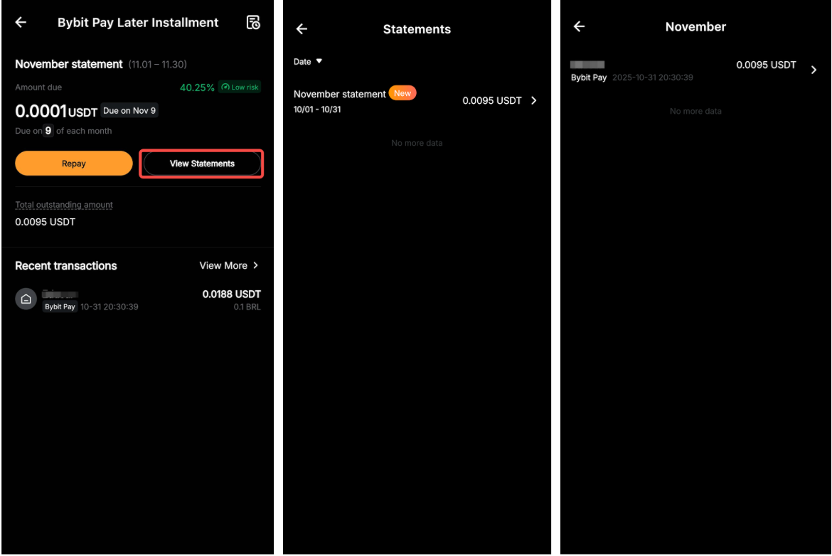 Tap View Statements to check your monthly statements, and tap the right arrow icon on the right to see all installment transactions for a specific month.