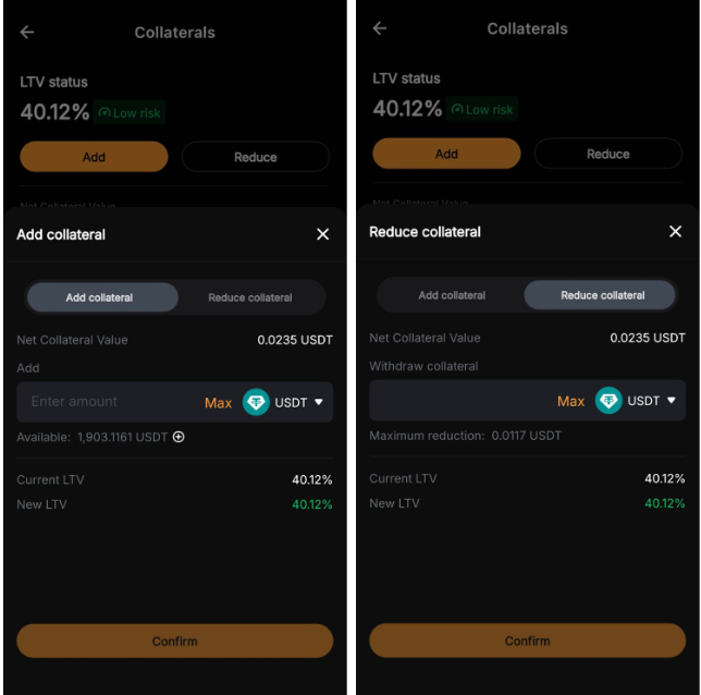 • Reduce: Opens the Reduce collateral tab. Choose the collateral token and enter the amount you'd like to reduce, or tap Max to remove the maximum allowable amount. Reducing collateral raises your LTV and increases liquidation risk.