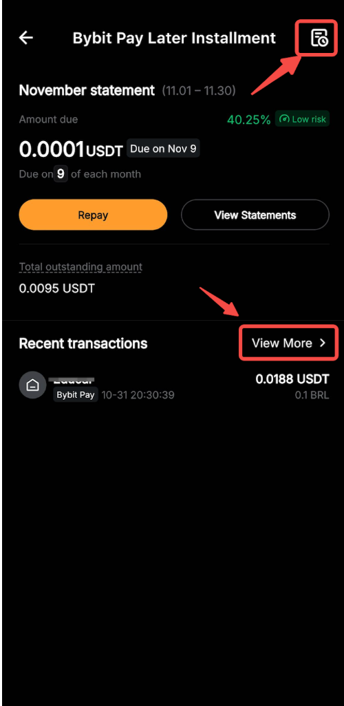 You can also tap the history icon in the top-right corner or select View More next to Recent transactions to access the Pay Later transaction page.