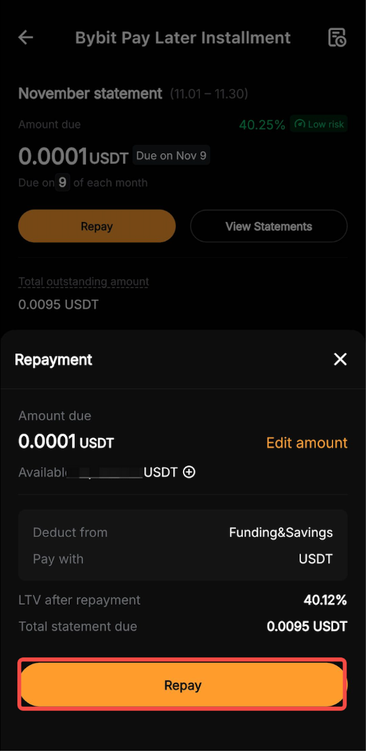 — Once a Pay Later order is confirmed, the installment plan cannot be changed or canceled. This means that even if your original Bybit Pay purchase is canceled or refunded, your Pay Later order will remain active, and you'll still need to make the required repayments according to your monthly statement.