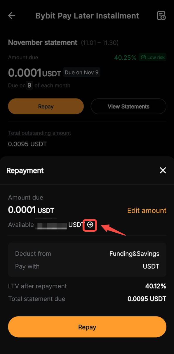 Step 2: In the Repayment pop-up window, choose to repay your monthly due amount in full, or tap Edit amount to enter a custom repayment amount.