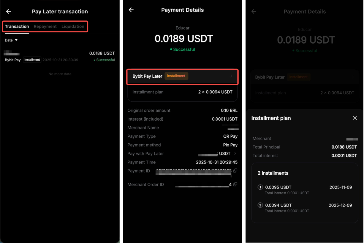From there, switch between the Transaction, Repayment and Liquidation tabs to view relevant details. Tap any transaction to open its Payment Details page, and tap the right arrow icon in the Bybit Pay Later section for more information.