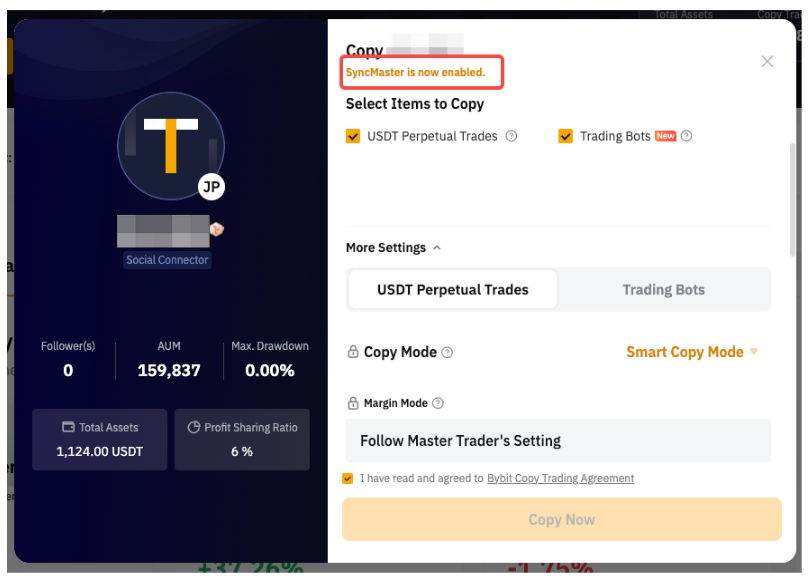 • 请注意,如果交易达人已在同步达人功能下开启强制同步,则跟单用户在更多设置下自定义的参数将不会生效。同步达人已开启状态将显示在参数设置窗口中。