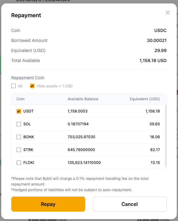 如果您没有足够的借用硬币,您可以用其他抵押资产全额偿还。系统将转换抵押品以偿还借入的硬币,并将收取0.1%的手续费。 |