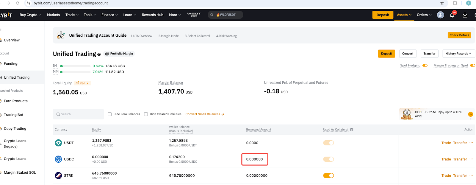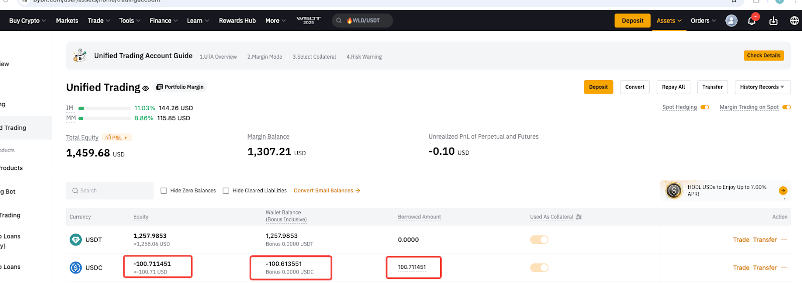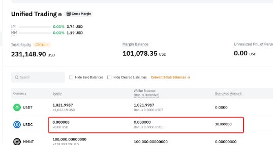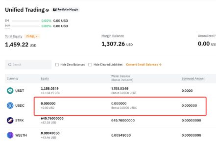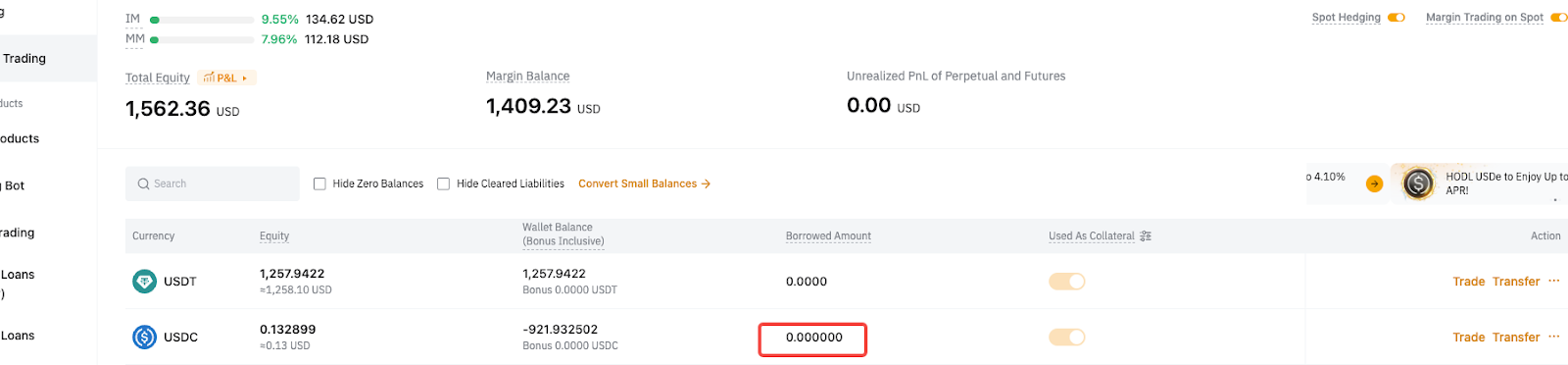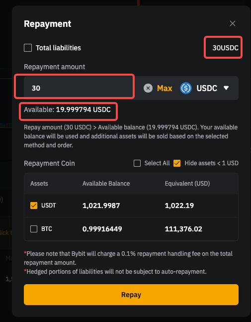 以 USDC 转账后,仅自动偿还衍生品负债,而即期负债仍未偿还。