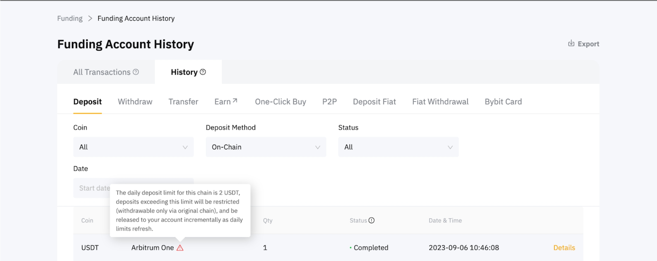 Bybit 為每個特定的區塊鏈設立了每日儲值限額。超過此限額的儲值資產將暫時成為不可交易資產,可在資金賬戶頁面的待處理資產部分查看。