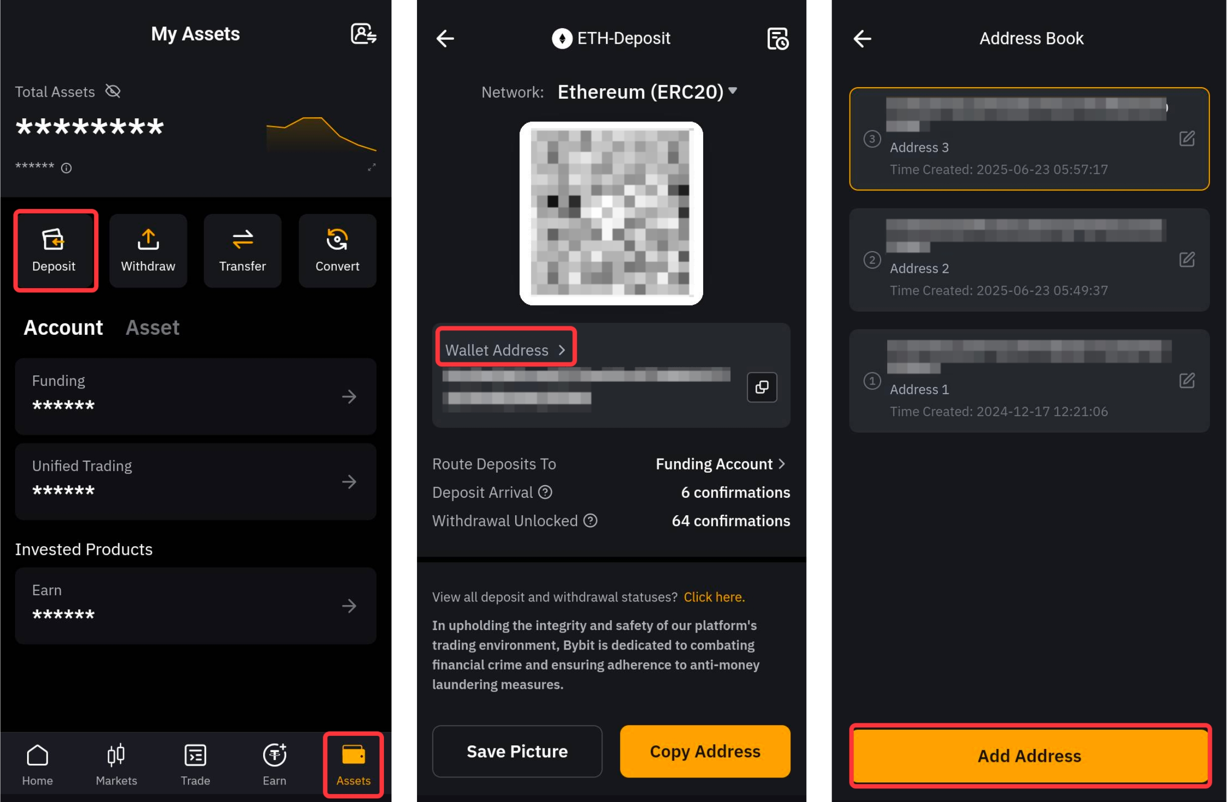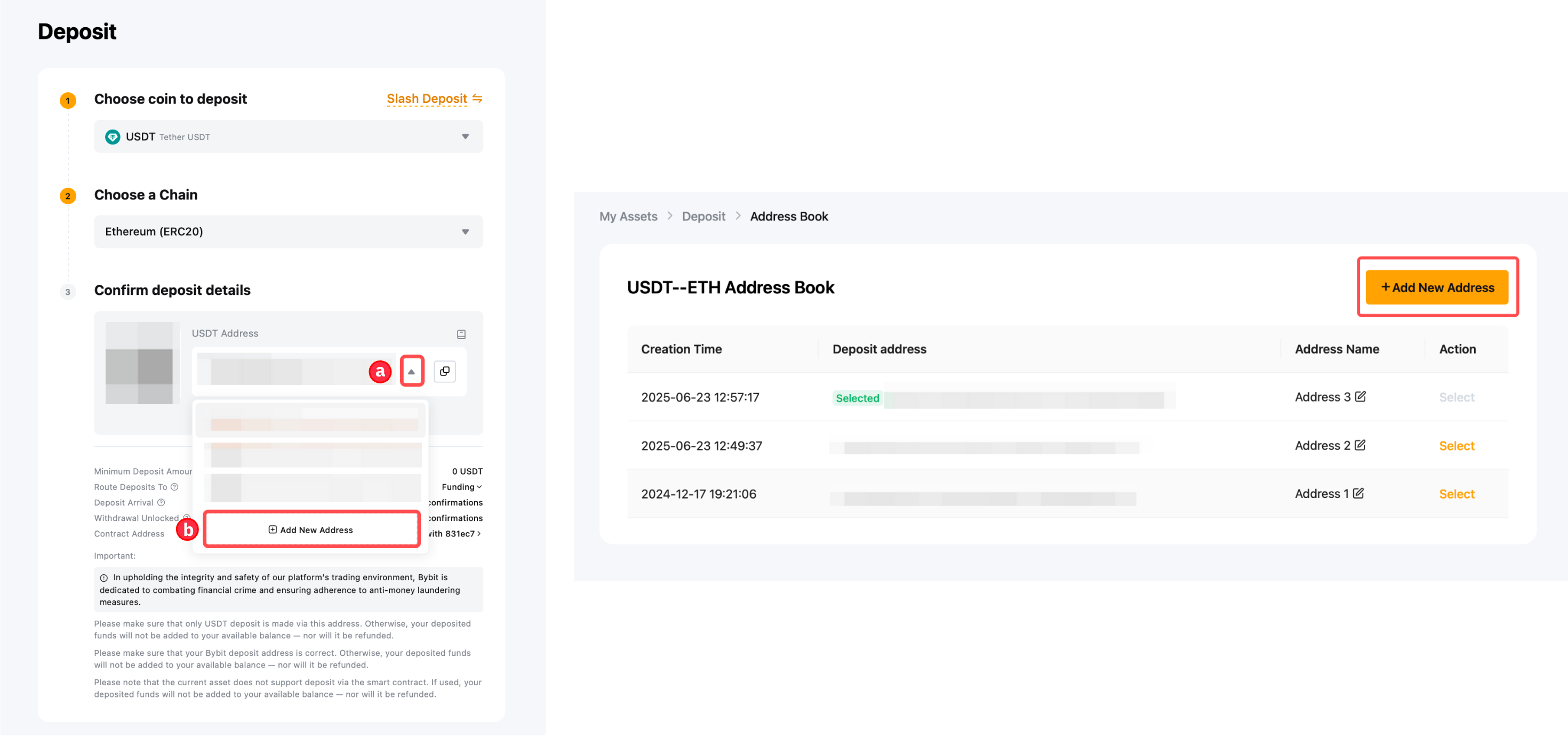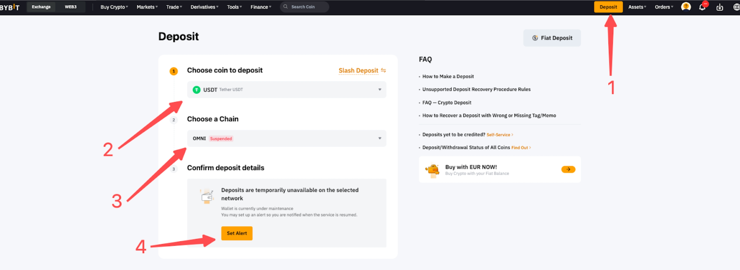 Bybit 僅支援通過相關的標準區塊鏈充入交易者的「資產」頁面上列出的代幣。
