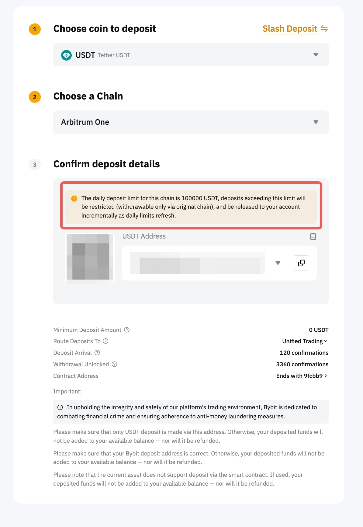 每日可解鎖的最大資產金額即為每日儲值限額。例如,Arbi 鏈的 USDT 儲值限額為 100,000 USDT,而您的 USDT 待處理資產總額為 300,000 USDT。300,000 USDT 將在三天內發放到您的賬戶,每天解鎖 100,000 USDT。
