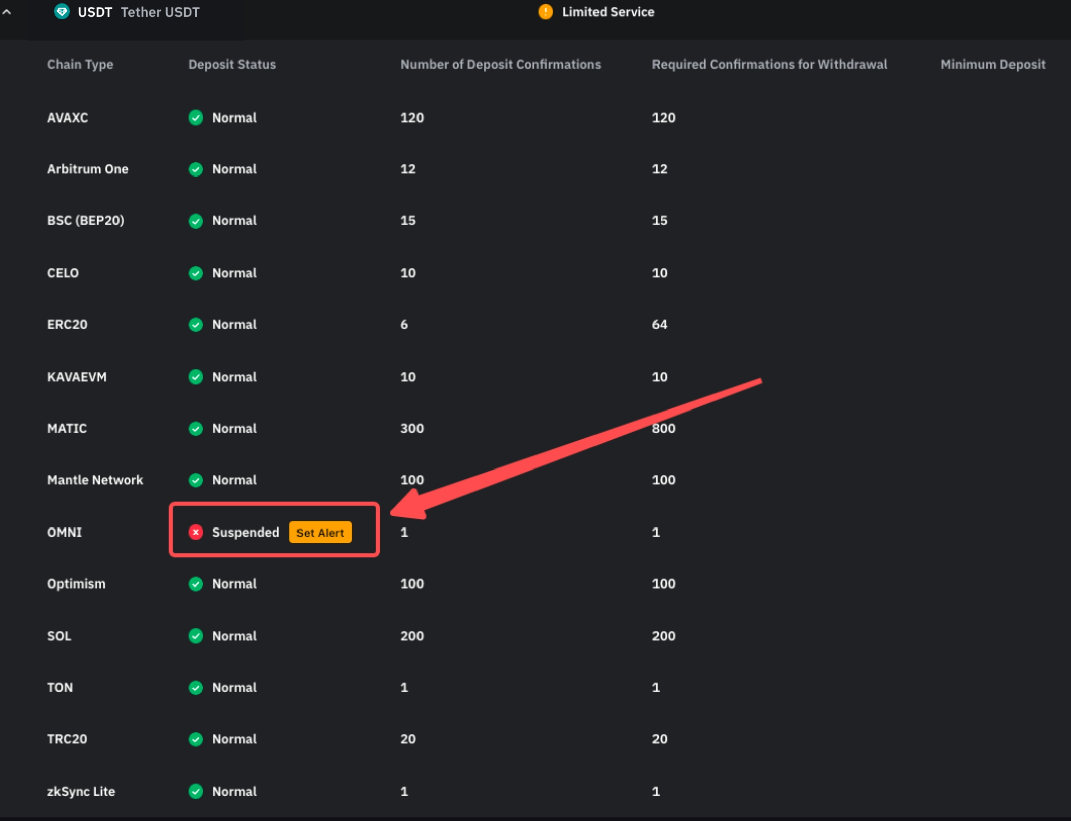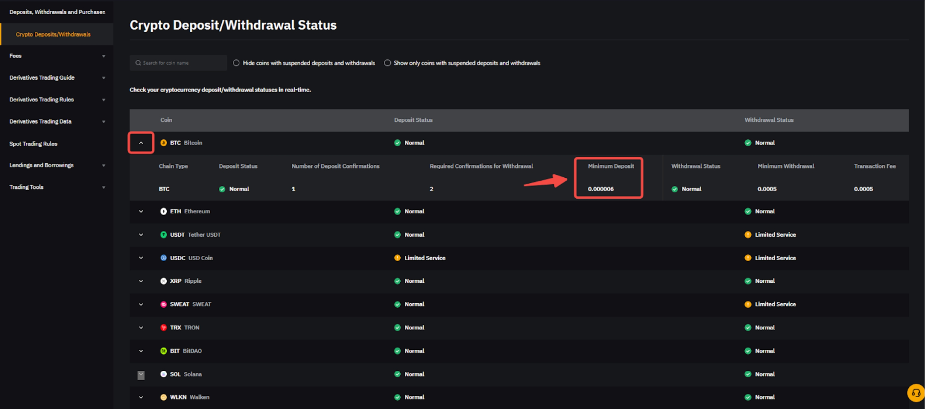 您可以在加密貨幣充提狀態頁面上找到每個幣種的最低儲值限額。點擊要儲值或提取的代幣的下拉按鈕,即可查看每個受支援的鏈的儲值狀態,以及成功完成儲值所需的操作信息。