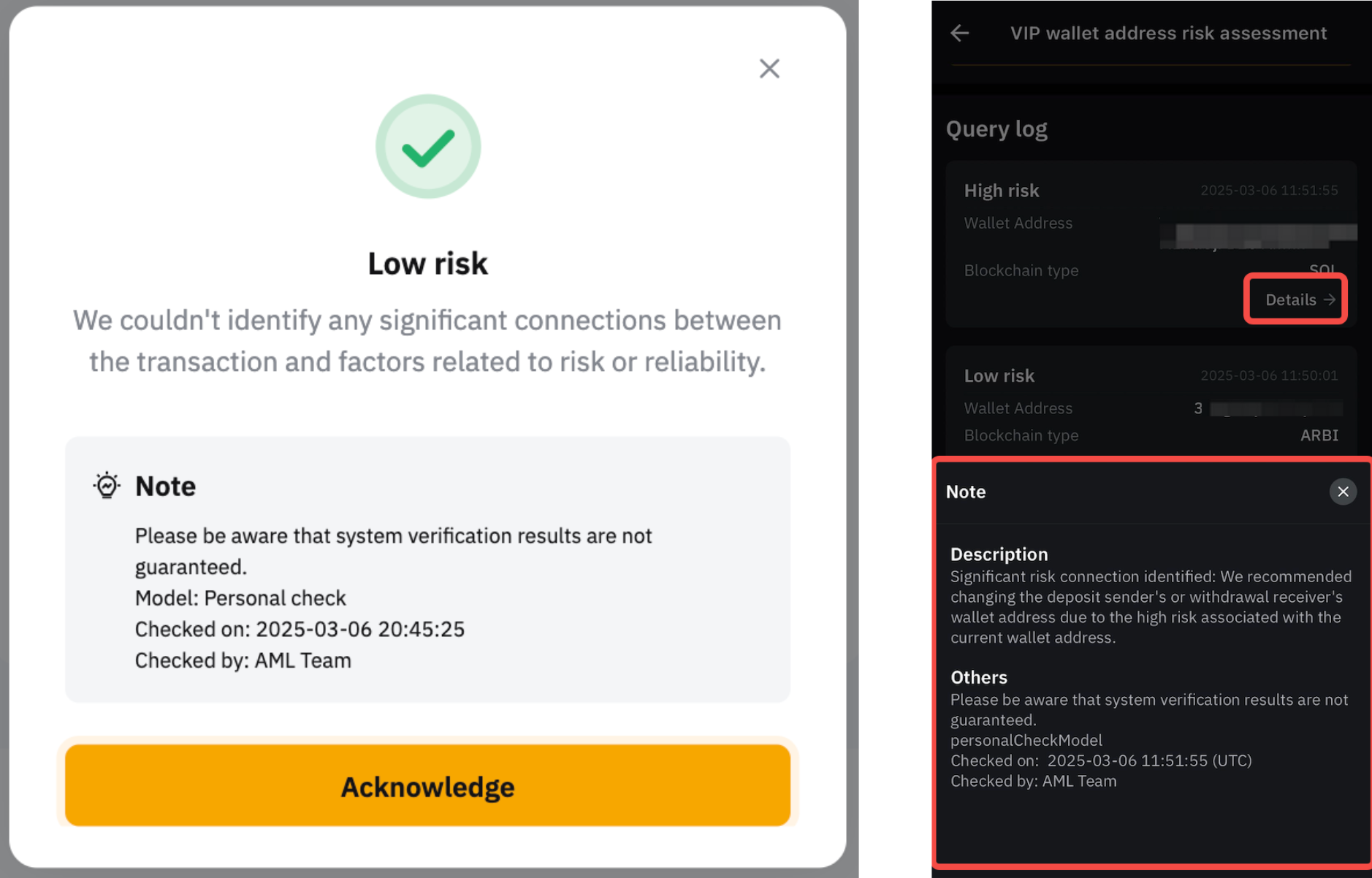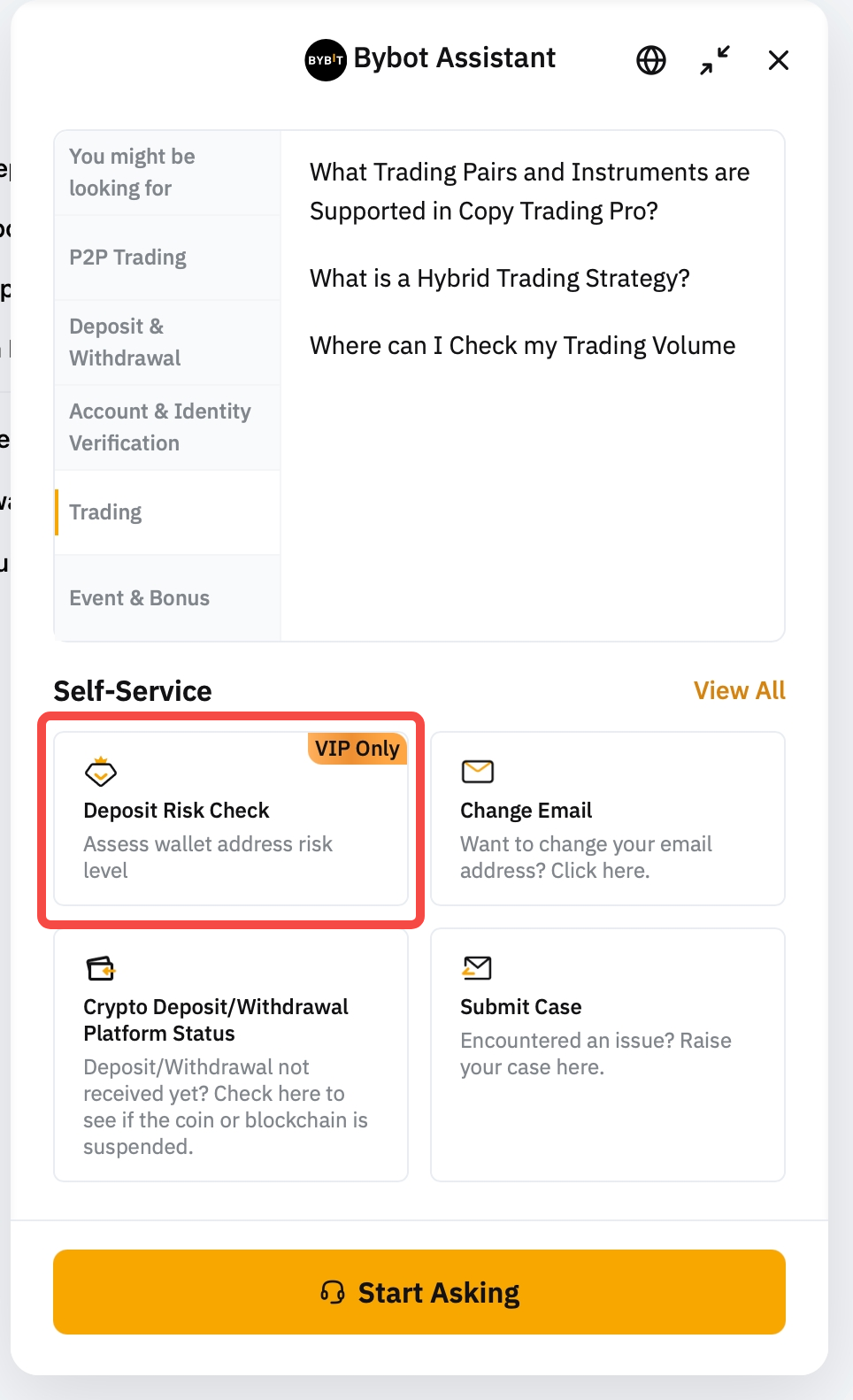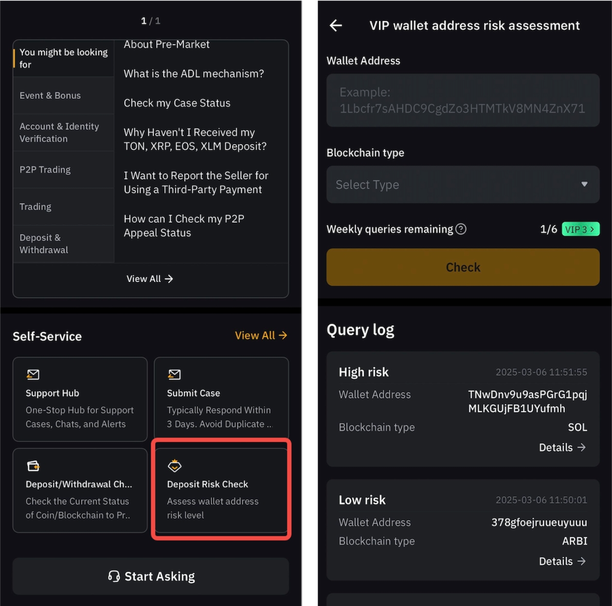 可以,目前只有 VIP 使用者可以透過自助服務機器人和存款頁面存取地址風險功能。使用者可以點按驗證存款來源地址風險存取頁面。