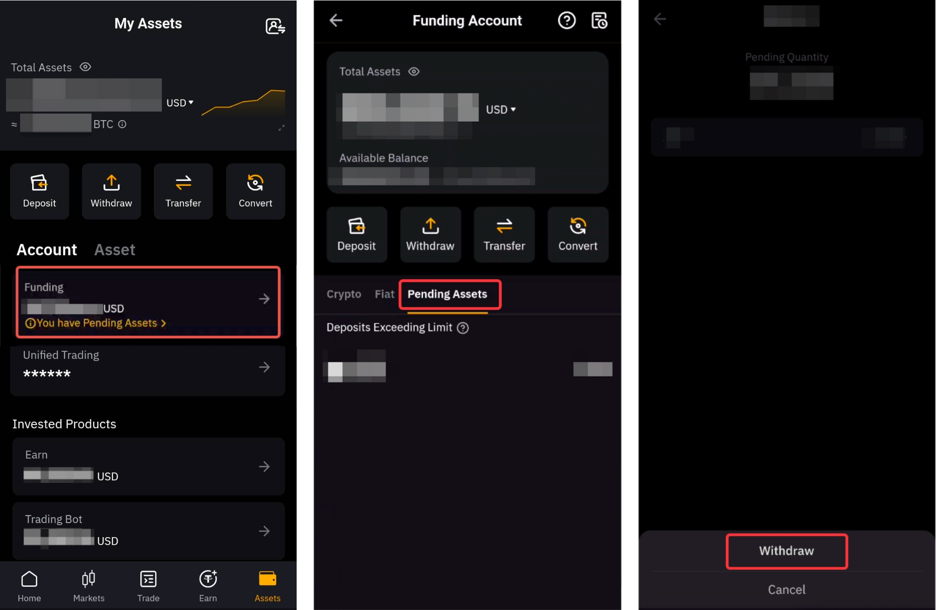 待處理資產是指等待特定區塊鏈進行入賬確認的儲值資產。這些儲值資產需要一定的時間才能進行交易或提幣,且受儲值限額限制。