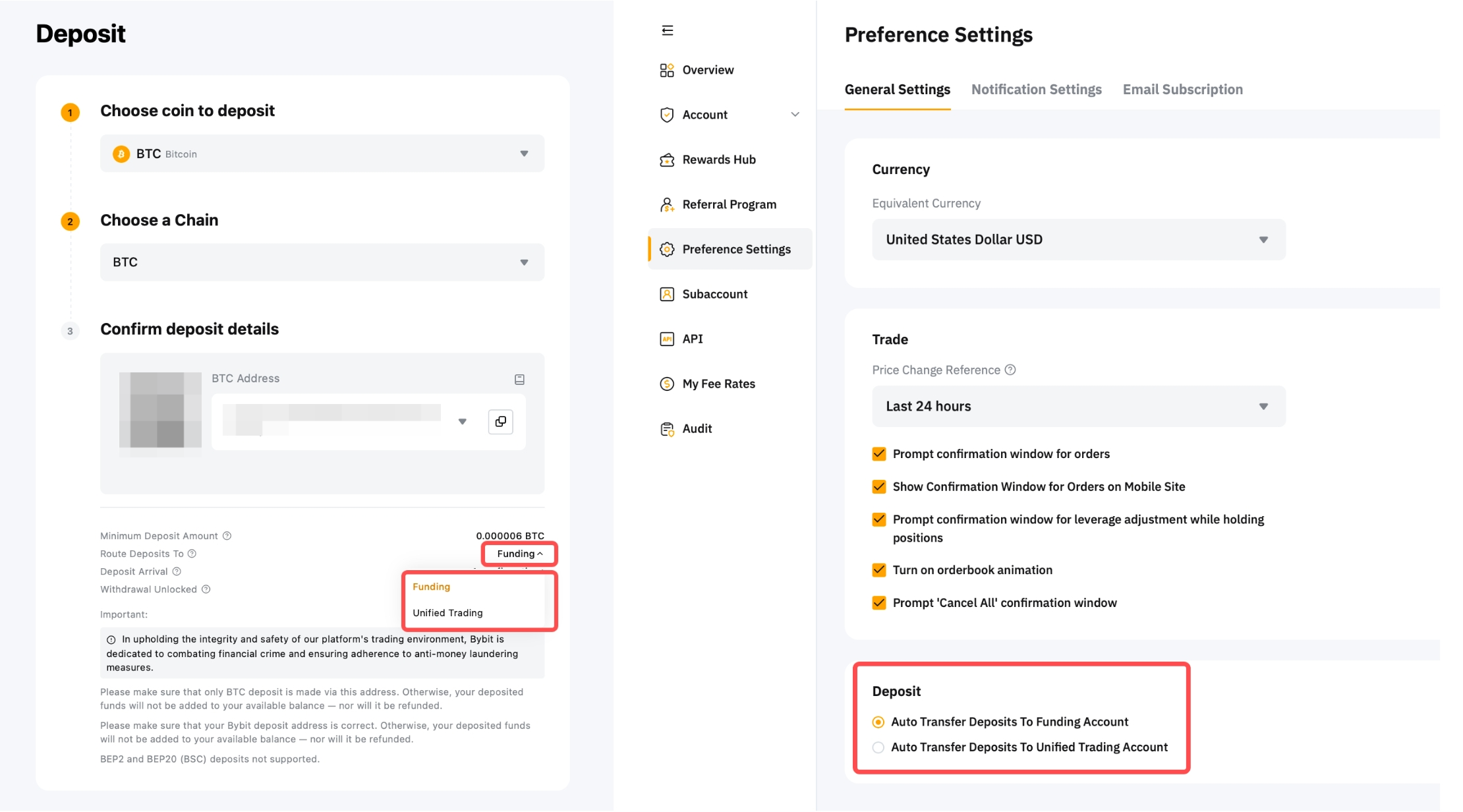 默認設置爲資金賬戶。 但是,您可以在「存款」頁面或「設置」頁面上將存款目的地更改爲您的統一交易賬戶。